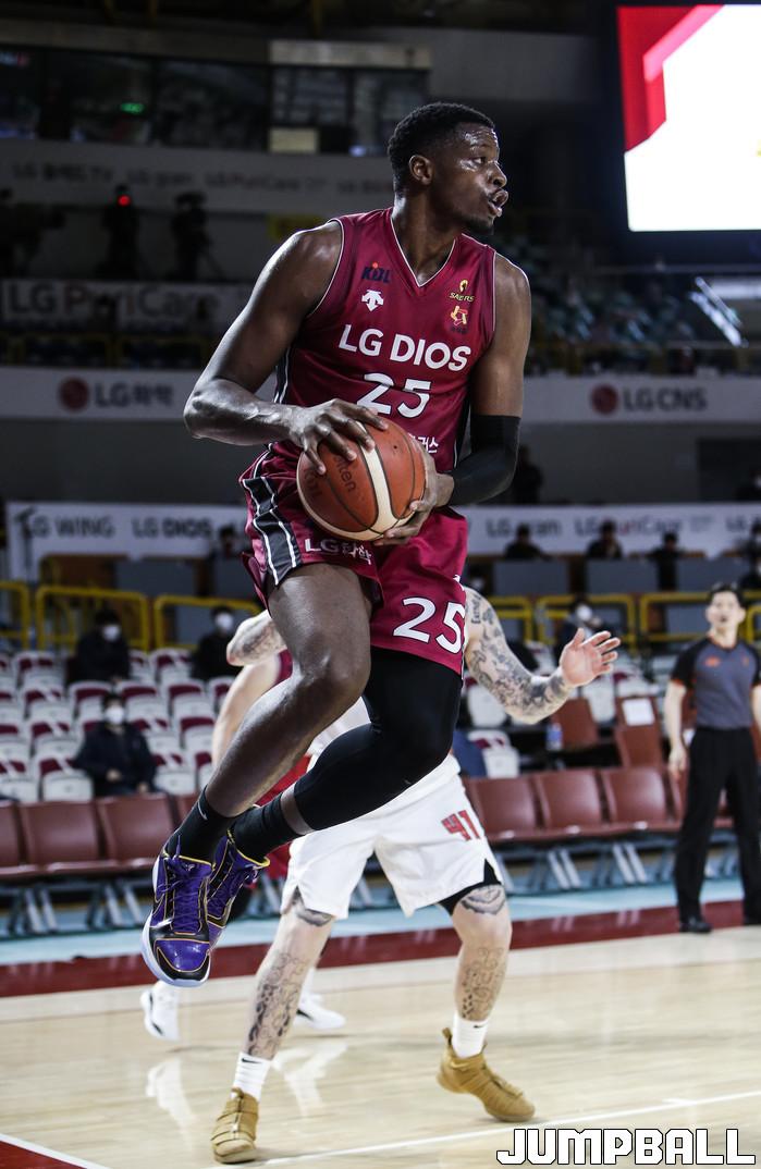 [점프볼=정을호 기자] 13 창원실내체육관에서 열린 2020-2021 현대모비스 프로농구  창원 LG 서울 SK 경기, LG 캐디 라렌이 리바운드를 성공하고 있다.