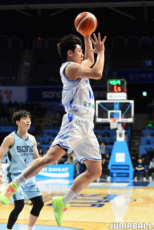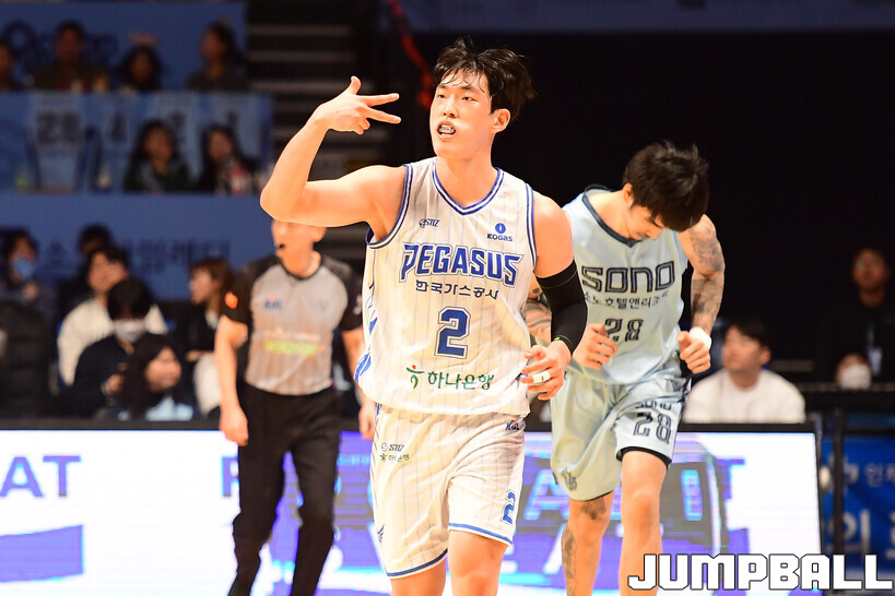 [점프볼=고양/박상혁 기자] 1일 고양 소노 아레나에서 열린 2025-2026 LG전자 프로농구 고양 소노와 대구 한국가스공사의 경기, 한국가스공사 신승민이 3점슛을 성공시킨 후 세리머니를 하고 있다.