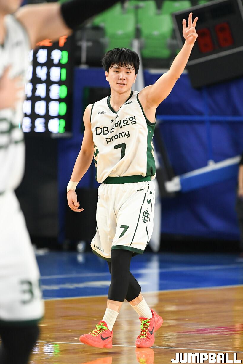 [점프볼=대구/유용우 기자] 14일 대구체육관에서 열린 2024-2025 KCC 프로농구 대구 한국가스공사와 원주 DB의 경기, DB 이용우가 3점슛을 성공하고 세레머니를 펼치고 있다.