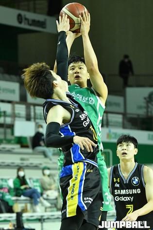 [점프볼=원주/유용우 기자] 27일 원주 종합체육관에서 열린 2020-2021 현대모비스 프로농구 원주 DB와 서울 삼성의 경기, 삼성 이동엽이 리버스 레이업을 시도하고 있다.