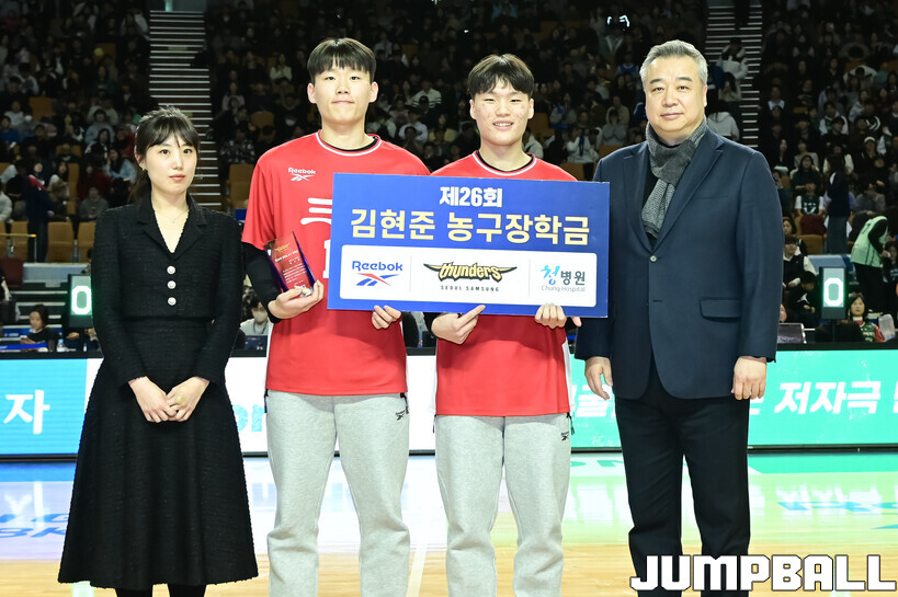 [점프볼=잠실/박상혁 기자] 7일 잠실체육관에서 열린 2025-2026 LG전자 프로농구 서울 삼성과 원주 DB의 경기, 하프타임때 삼성 임근배 단장과 고 김현준 선수 장녀 김세희씨가 함께해 경복고 윤지원, 윤지훈의 김현준 농구장학금 전달식을 진행했다.