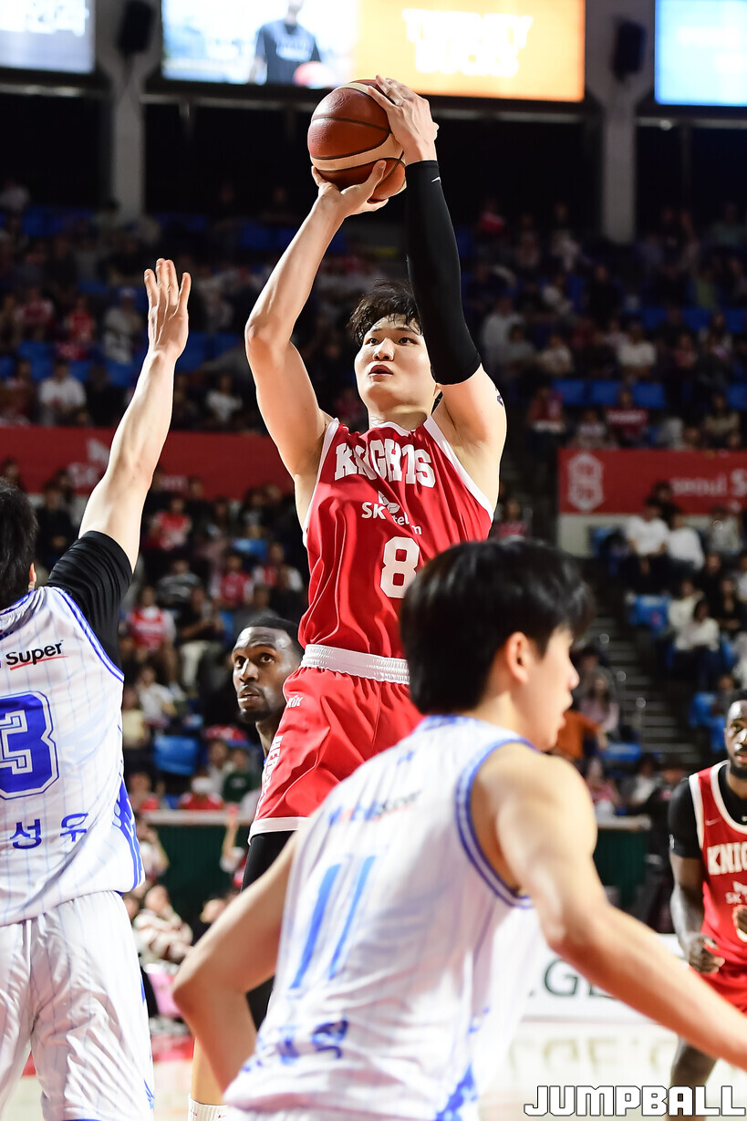 [점프볼=잠실학생/박상혁 기자] 4일 잠실학생체육관에서 열린 2025-2026 LG전자 프로농구 서울 SK와 대구 한국가스공사의 경기, SK 안영준이 슛을 시도하고 있다.