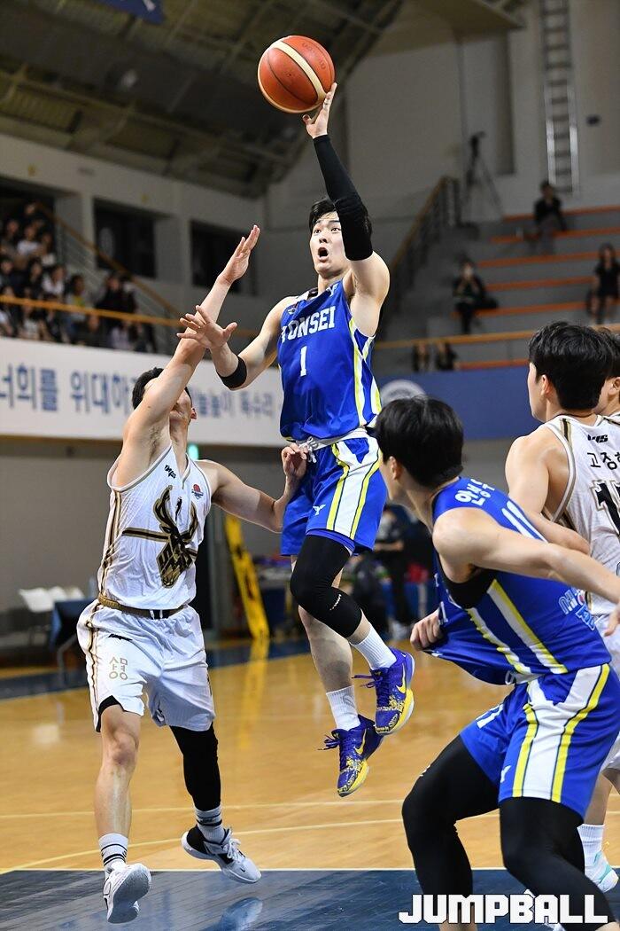 5일 연세대학교 신촌캠퍼스체육관에서 열린 2023 KUSF 대학농구 U-리그 연세대와 상명대의 경기, 연세대 이민서가 슛을 시도하고 있다. [점프볼=신촌/유용우 기자]