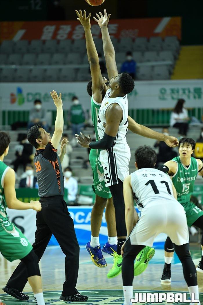 [점프볼=원주/유용우 기자] 10일 원주 종합체육관에서 열린 2020-2021 현대모비스 프로농구 원주 DB와 창원 LG의 경기가 점프볼로 시작되고 있다.