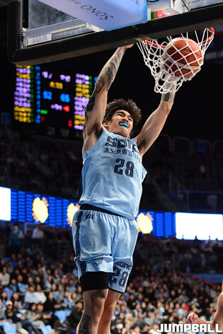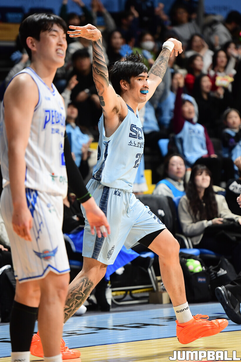 [점프볼=고양/박상혁 기자] 1일 고양 소노 아레나에서 열린 2025-2026 LG전자 프로농구 고양 소노와 대구 한국가스공사의 경기, 소노 켐바오가 슛을 성공시킨 후 세리머니를 하고 있다.