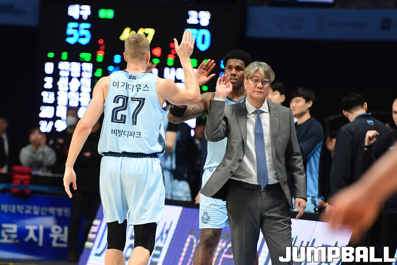 [점프볼=고양/박상혁 기자] 1일 고양 소노 아레나에서 열린 2025-2026 LG전자 프로농구 고양 소노와 대구 한국가스공사의 경기, 소노 손창환 감독이 이기디우스와 하이파이브를 하고 있다.