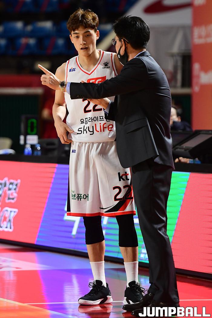 [점프볼=잠실학생/박상혁 기자] 25일 잠실학생체육관에서 열린 2020-2021 현대모비스 프로농구 서울 SK와 부산 KT의 경기, KT 서동철 감독이 문상옥에게 지시를 내리고 있다.