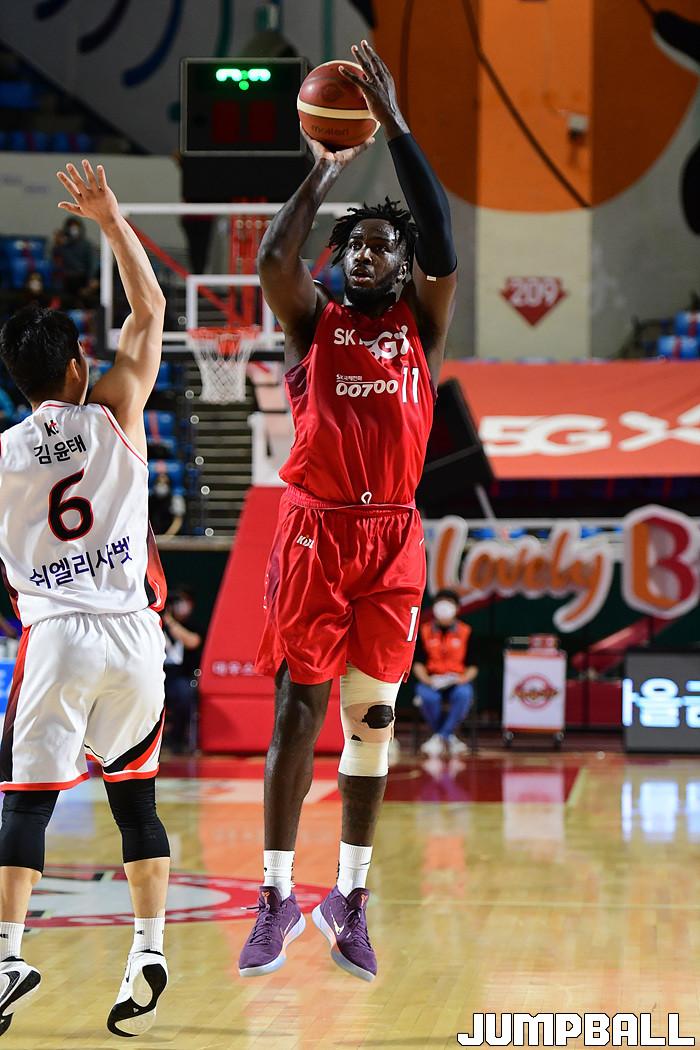 [점프볼=잠실학생/박상혁 기자] 25일 잠실학생체육관에서 열린 2020-2021 현대모비스 프로농구 서울 SK와 부산 KT의 경기, SK 자밀 워니가 3점슛을 시도하고 있다.