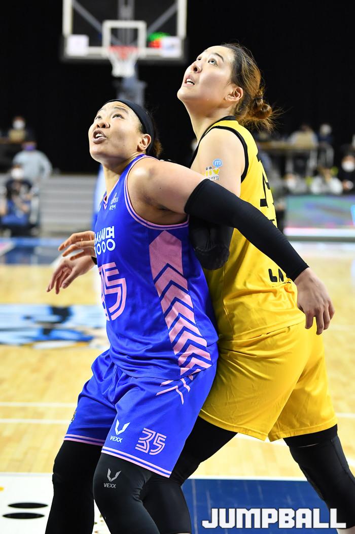 [점프볼=용인/유용우 기자] 15일 용인실내체육관에서 열린 'KB국민은행 Liiv M 2020-2021 여자프로농구' 용인 삼성생명과 청주 KB의 챔피언결정전 5차전, 삼성생명 김한별과 KB 박지수가 박스아웃 경쟁을 펼치고 있다.