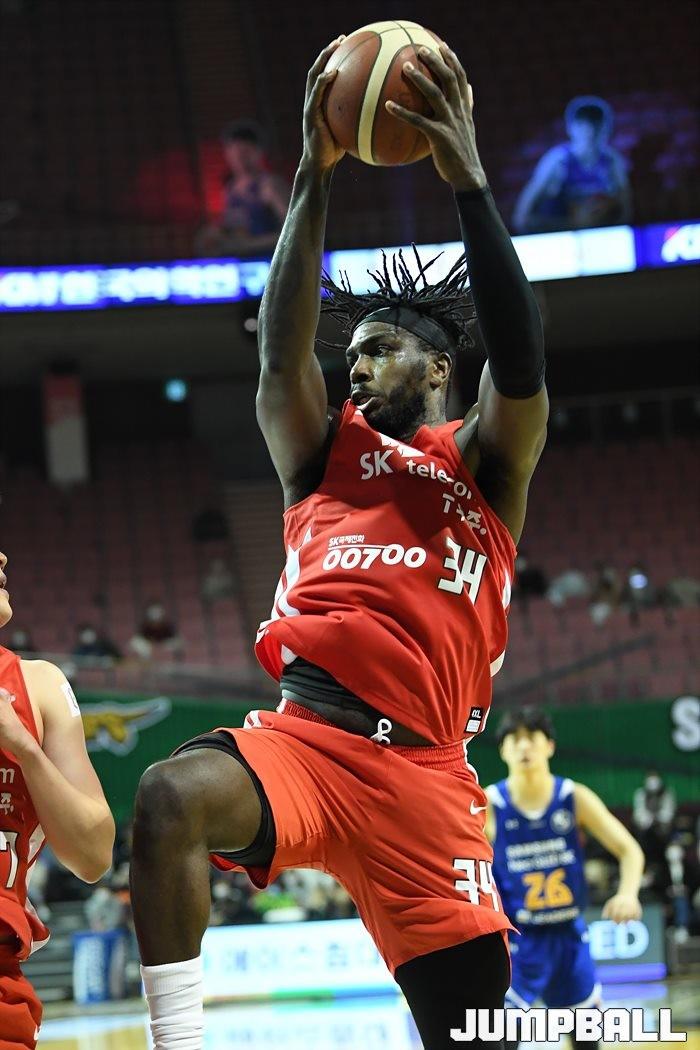 13일 잠실실내체육관에서 열린 2021-2022 KGC인삼공사 정관장 프로농구 서울 삼성과 서울 SK의 S-더비 4차전, SK 자밀 워니가 리바운드를 잡고 있다.