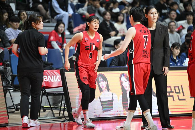 부산 BNK썸과 인천 신한은행은 16일 부산사직체육관에서 BNK금융 2025~2026 여자프로농구 정규리그 개막전을 치렀다. 승부에서는 BNK가 김소니아, 김정은이 각각 14점을 올린 데에 힘입어 65-54로 승리했다.
