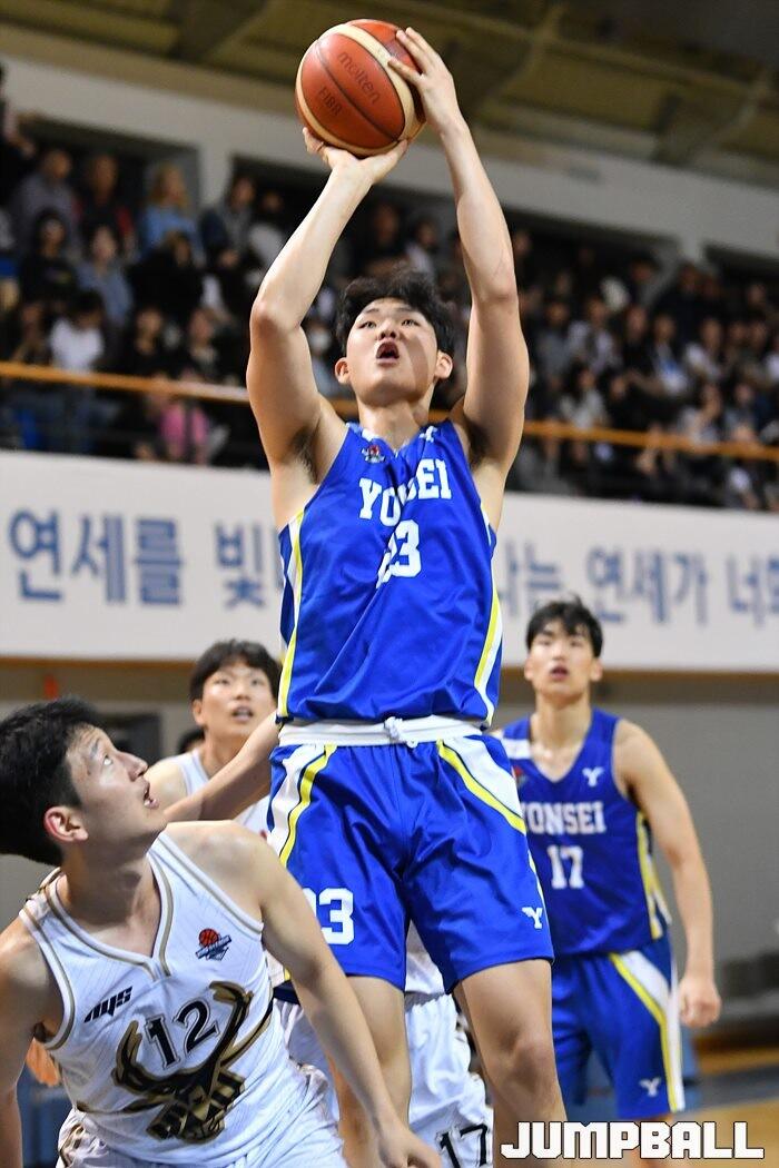 5일 연세대학교 신촌캠퍼스체육관에서 열린 2023 KUSF 대학농구 U-리그 연세대와 상명대의 경기, 연세대 이규태가 슛을 시도하고 있다. [점프볼=신촌/유용우 기자]
