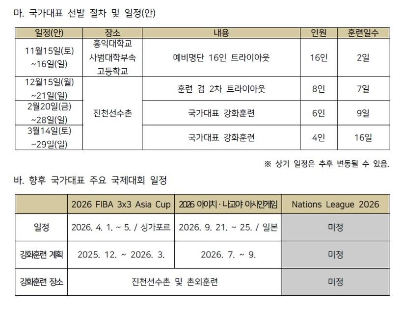 참고로 트라이아웃에 참가한 16명은 2024년과 2025년 올팍투어에 참가한 선수들 중 협회의 선발 기준에 부합하는 검증된 선수들이다. 협회는 올팍투어와 트라이아웃에서 활약을 토대로 3x3 종목에 맞는 선수 조합 등을 고려해 옥석을 가리기로 했다.