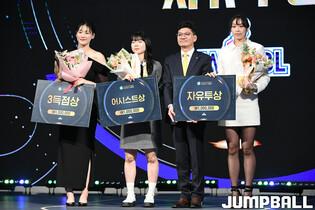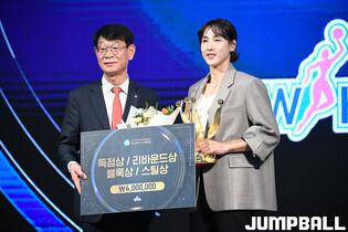 [점프볼=용산/유용우 기자] 24일 서울드래곤시티 3층 그랜드볼룸 한라홀에서 열린 하나은행 2024-2025 여자프로농구 정규리그 시상식, 삼성생명 키아나 스미스가 포카리스웨트 MIP에 선정됐다.