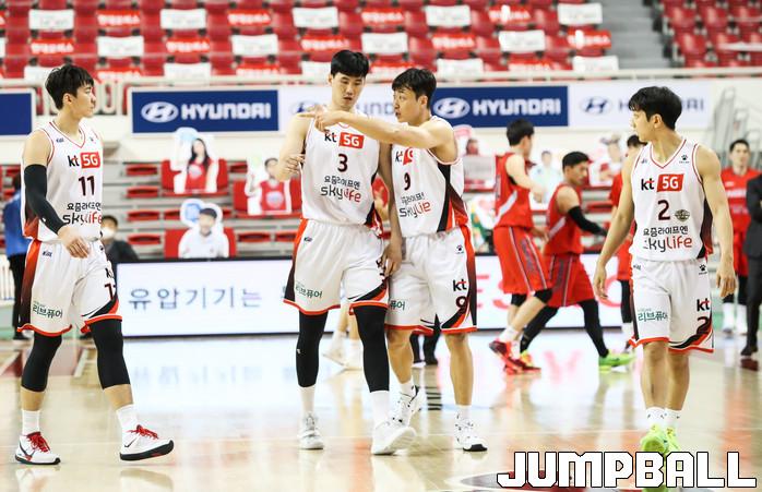 [점프볼=윤민호 기자]26일 울산 동천체육관에서 열린 2020-2021 현대모비스 프로농구 울산 현대모비스와 부산 KT의 경기에서 KT 김영환이 동료선수들과 작전에 대해 말하고 있다.