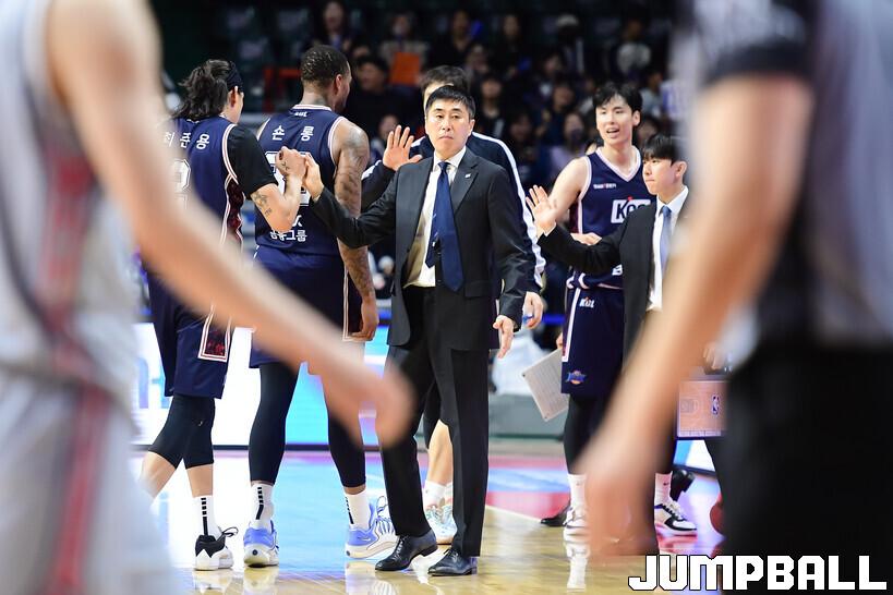 [점프볼=부산/박상혁 기자] 15일 부산사직체육관에서 열린 2025-2026 LG전자 프로농구 부산 KCC와 울산 현대모비스의 경기, KCC 이상민 감독이 선수들과 하이파이브를 하고 있다.