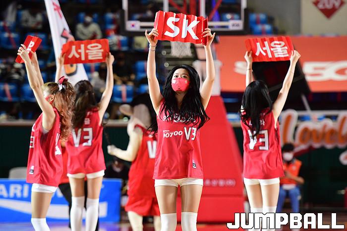 [점프볼=잠실학생/박상혁 기자] 25일 잠실학생체육관에서 열린 2020-2021 현대모비스 프로농구 서울 SK와 부산 KT의 경기, SK 치어리더가 응원을 하고 있다.