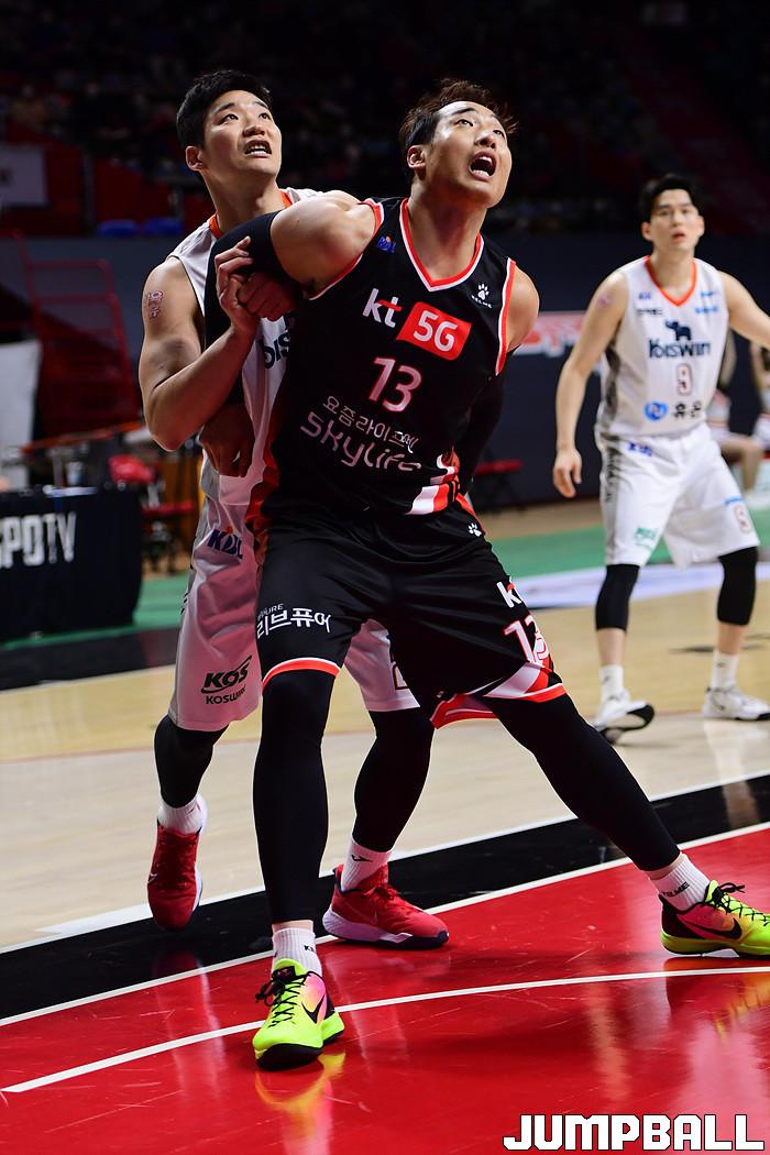 [점프볼=부산/박상혁 기자] 27일 부산사직체육관에서 열린 2020-2021 현대모비스 프로농구 부산 KT와 인천 전자랜드의 경기, KT 김현민과 전자랜드 이대헌이 리바운드 자리 다툼을 벌이고 있다.