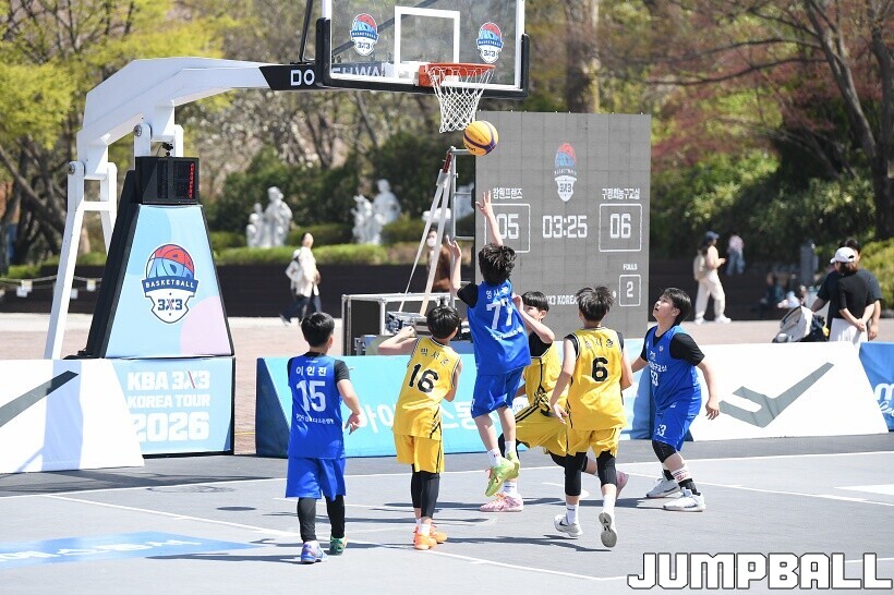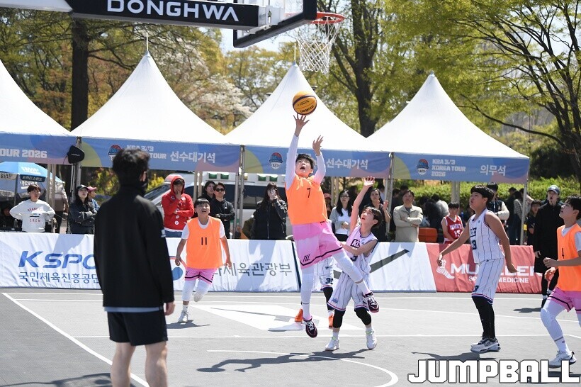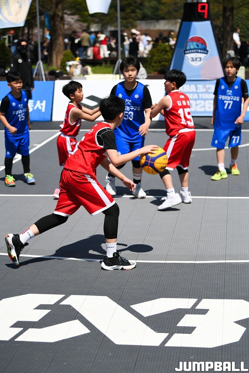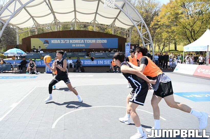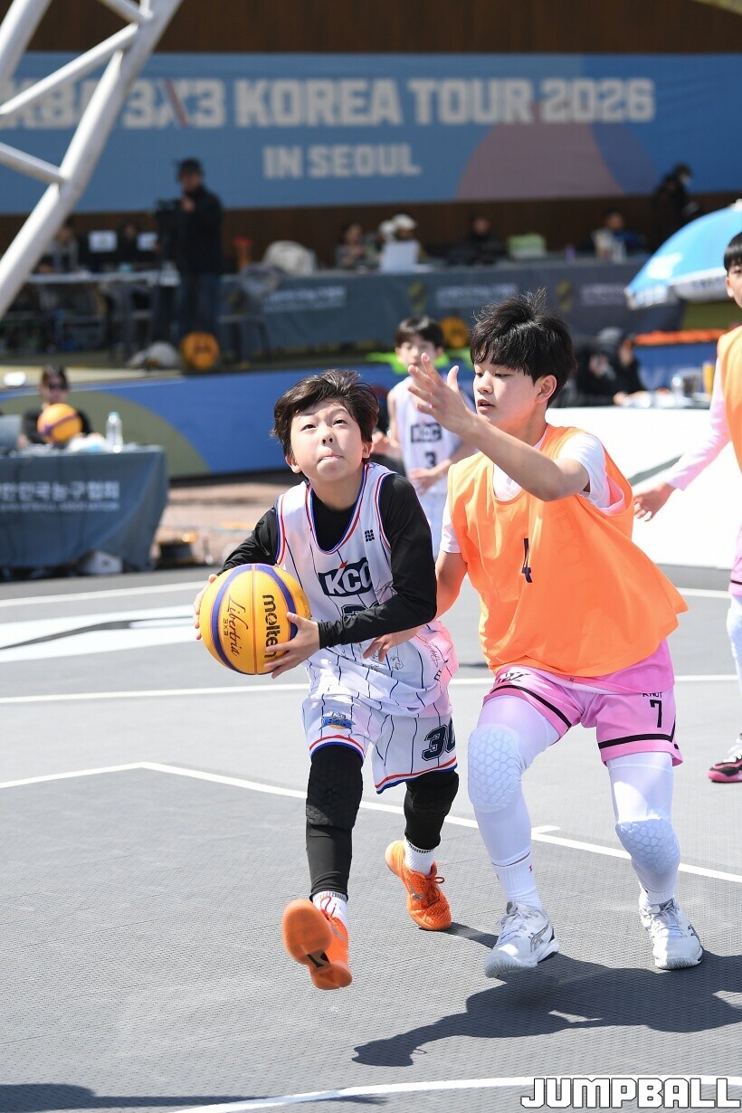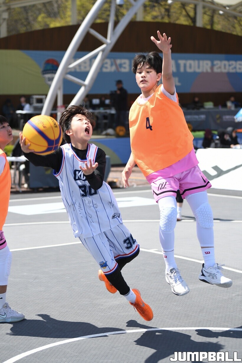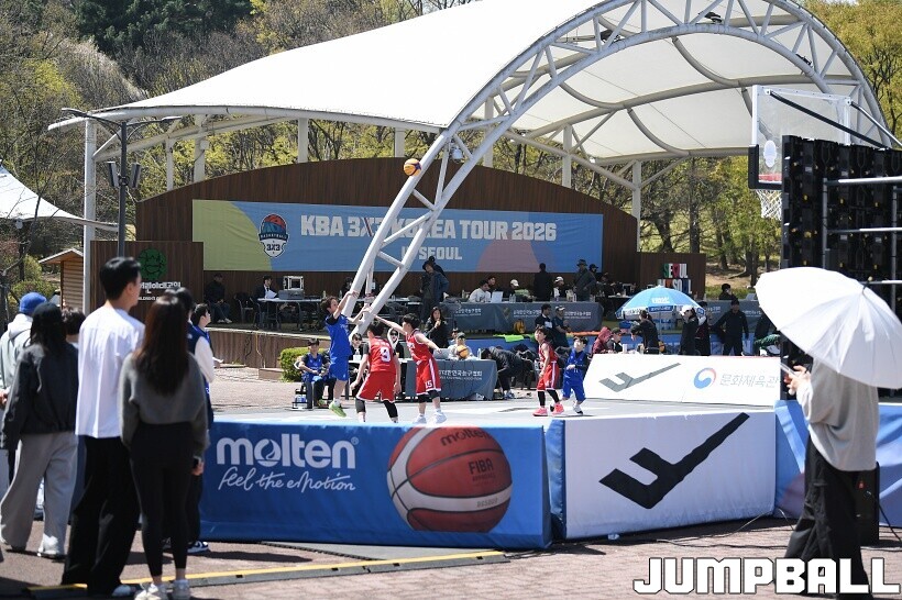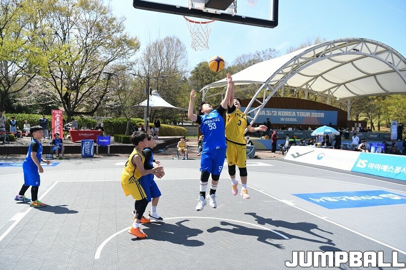 [점프볼=서울/유용우 기자] 12일 서울어린이대공원 열린무대 앞 특설코트에서 KBA 3x3 코리아투어 2026 서울대회 2일차 경기가 열렸다. 초등부, 중등부, 고등부, 오픈부, 여자오픈부 5개 종별 61개팀 234명이 참가했다. KBA 3x3 코리아투어 2026 서울대회 참가 선수들이 본선 토너먼트에 돌입하여 치열한 경쟁을 펼쳤다.