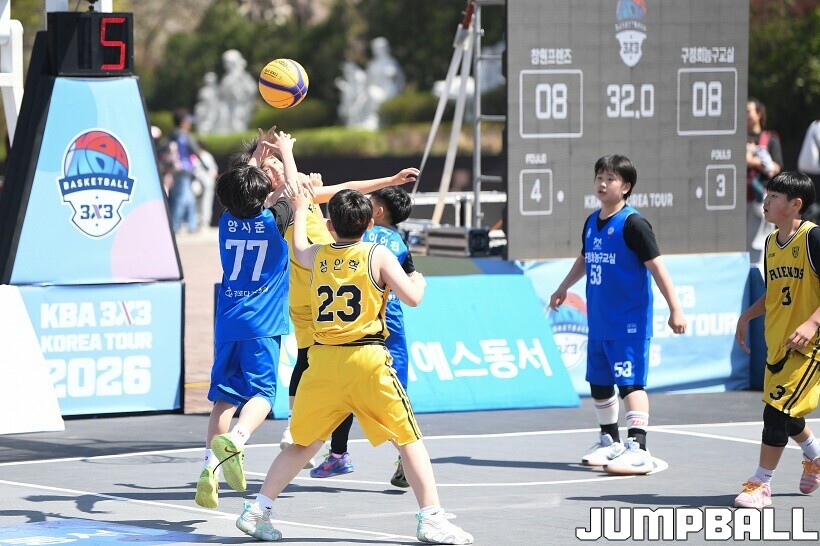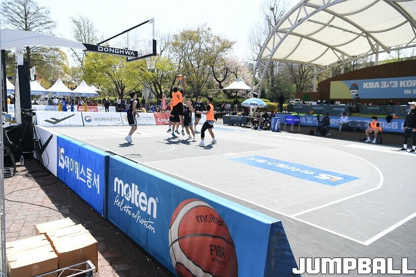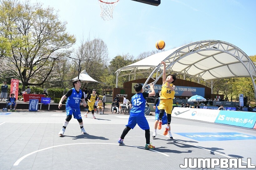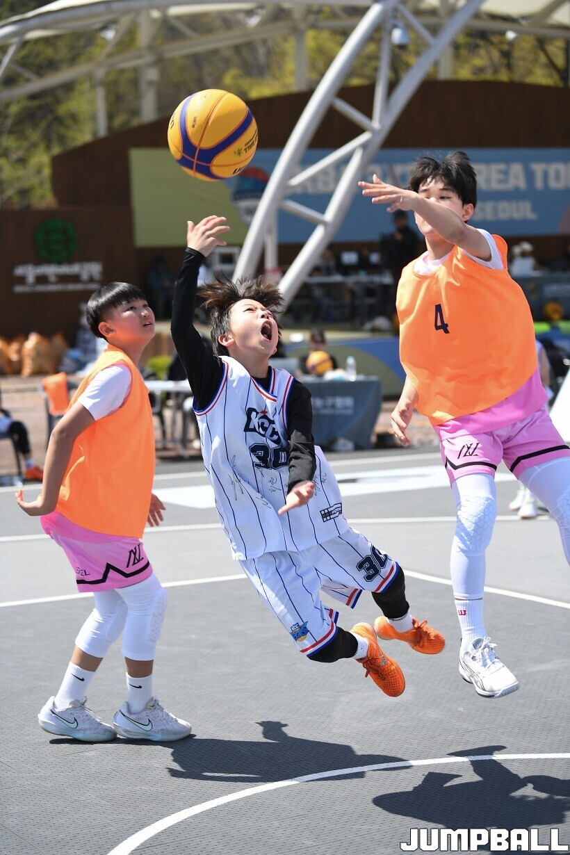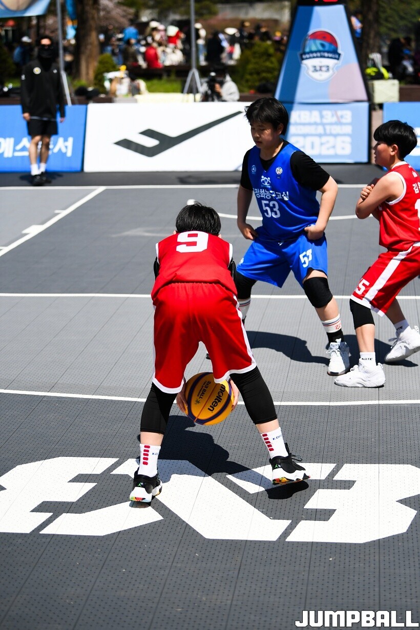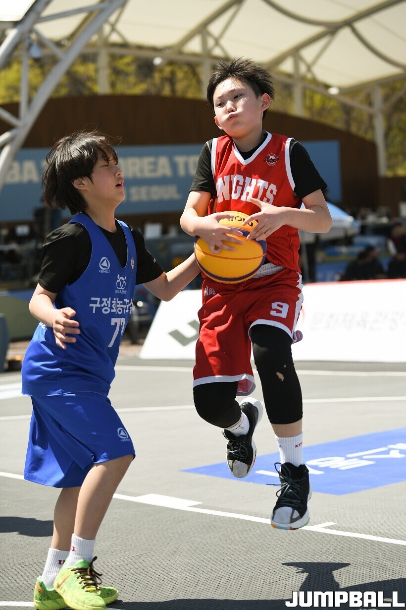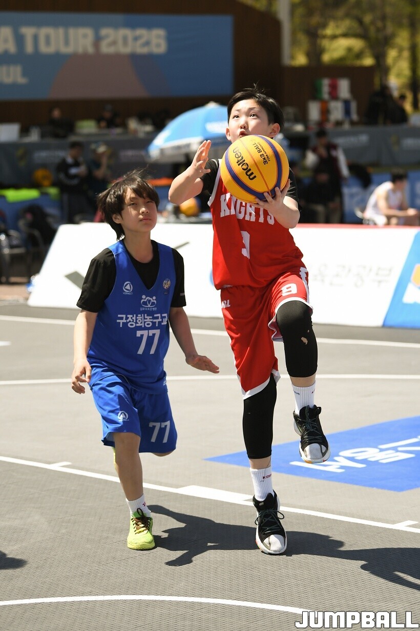 [점프볼=서울/유용우 기자] 12일 서울어린이대공원 열린무대 앞 특설코트에서 KBA 3x3 코리아투어 2026 서울대회 2일차 경기가 열렸다. 초등부, 중등부, 고등부, 오픈부, 여자오픈부 5개 종별 61개팀 234명이 참가했다. KBA 3x3 코리아투어 2026 서울대회 참가 선수들이 본선 토너먼트에 돌입하여 치열한 경쟁을 펼쳤다.