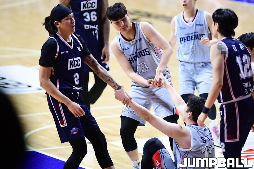 [점프볼=부산/박상혁 기자] 15일 부산사직체육관에서 열린 2025-2026 LG전자 프로농구 부산 KCC와 울산 현대모비스의 경기, 현대모비스 이대균과 KCC 최준용이 함지훈을 일으켜 세워주고 있다.