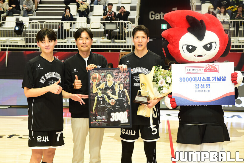 [점프볼=수원/박상혁 기자] 3일 수원 KT 소닉붐 아레나에서 열린 2025-2026 LG전자 프로농구 수원 KT와 창원 LG의 경기, 경기 시작 전 KT 김선형의 3000어시스트 기념 시상식을 진행했다.