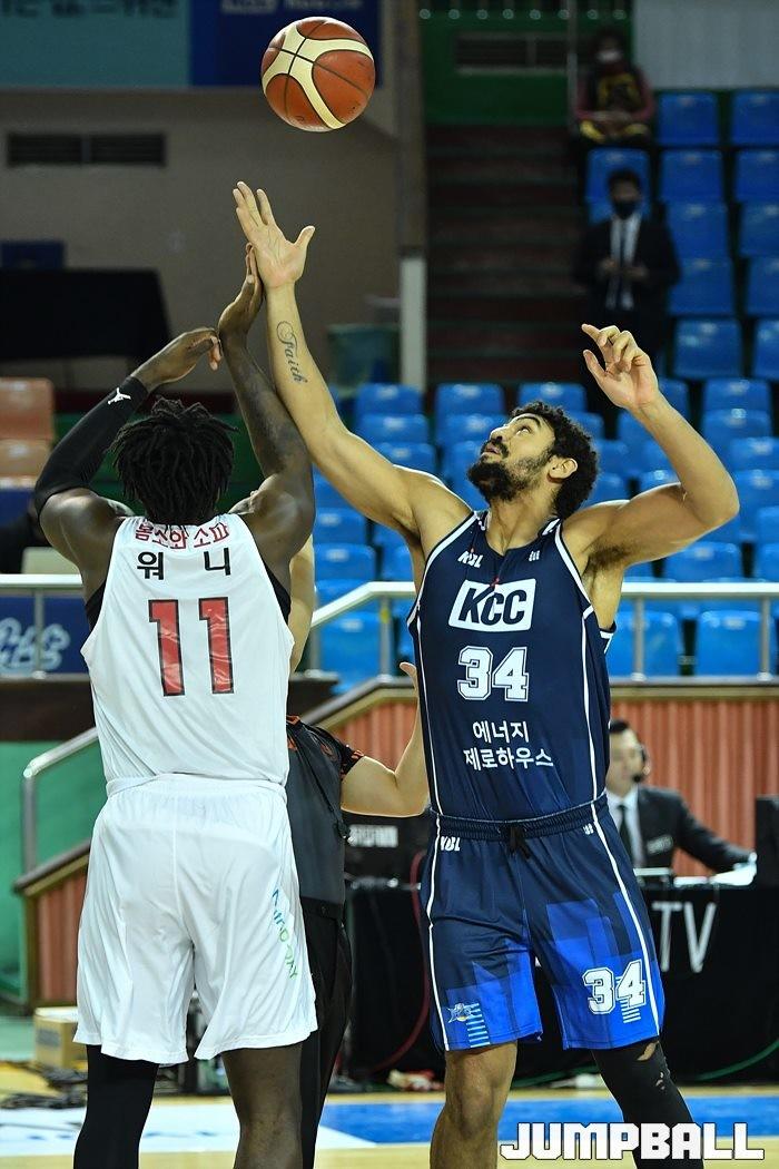 [점프볼=군산/유용우 기자] 22일 군산 월명체육관에서 열린 2020-2021 현대모비스 프로농구 전주 KCC와 서울 SK의 경기, KCC 타일러 데이비스와 SK 자밀 워니의 점프볼로 시작되고 있다.