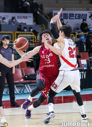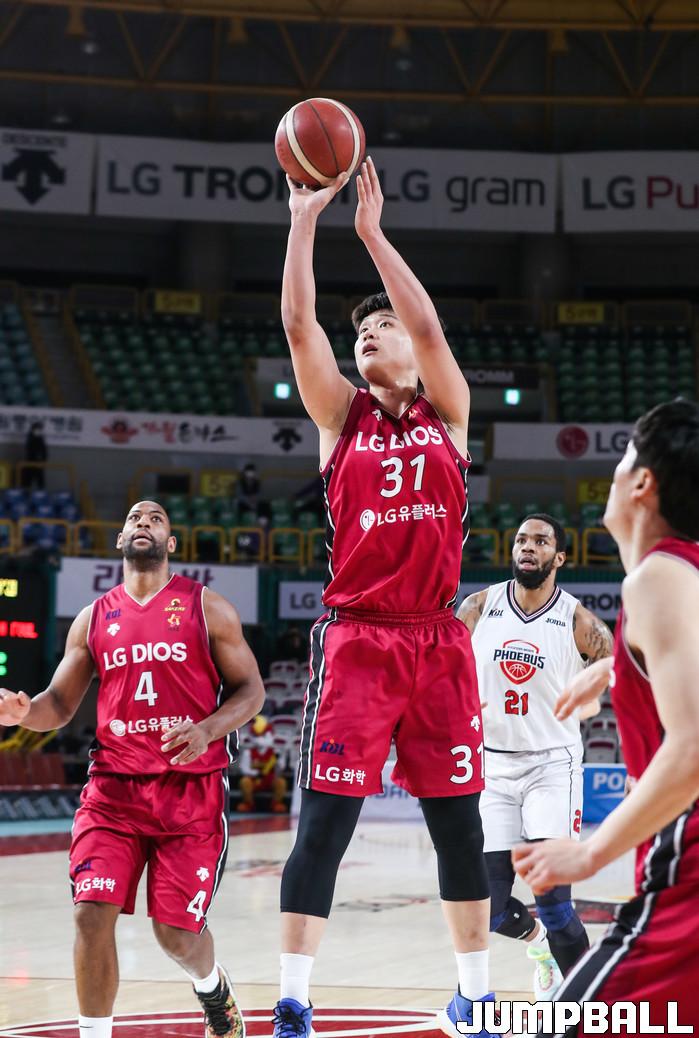 [점프볼=윤민호 기자]12일 창원실내체육관에서 열린 2020-2021 현대모비스 프로농구 창원 LG와 울산 현대모비스의 경기에서 LG 박정현이 슛을 하고 있다.