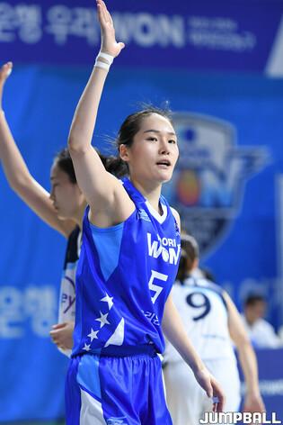 [점프볼=아산/박상혁 기자] 23일 아산이순신체육관에서 열린 우리은행 우리WON 2023-2024 여자프로농구 우리은행과 신한은행의 경기, 신한은행 김소니아가 환호하고 있다.