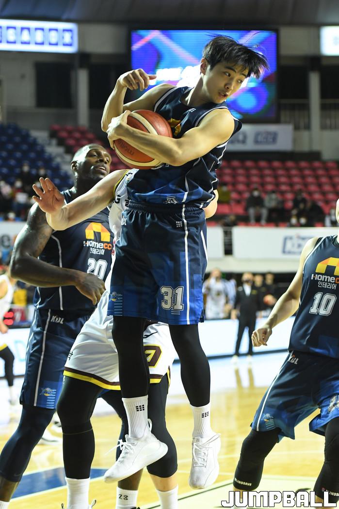 9일 전주실내체육관에서 열린 2021-2022 KGC인삼공사 정관장 프로농구 전주 KCC와 창원 LG의 경기, KCC 이진욱이 리바운드를 잡아내고 있다.