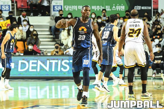 9일 전주실내체육관에서 열린 2021-2022 KGC인삼공사 정관장 프로농구 전주 KCC와 창원 LG의 경기, KCC 라건아가 3점슛을 성공시킨후 세레머니를 하고 있다.