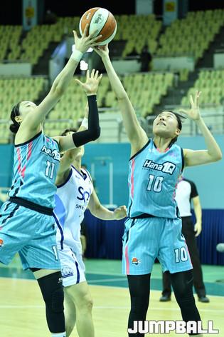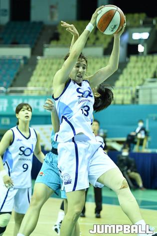 [점프볼=부천/유용우 기자] 22일 부천체육관에서 열린 'KB국민은행 Liiv M 2020-2021 여자프로농구' 하나원큐와 신한은행의 경기, 신한은행 이다연의 돌파를 하나원큐 강이슬이 수비로 저지하고 있다.