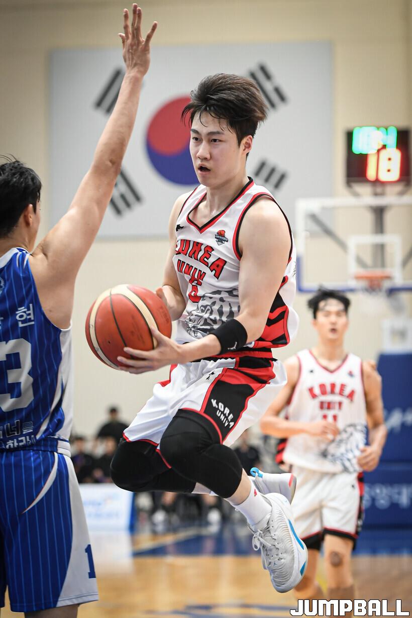 [점프볼=안성/박상혁 기자] 7일 중앙대 안성캠퍼스 체육관에서 열린 2023 KUSF 대학농구 U-리그 중앙대와 고려대의 경기, 고려대 박정환이 더블 클러치를 시도하고 있다.
