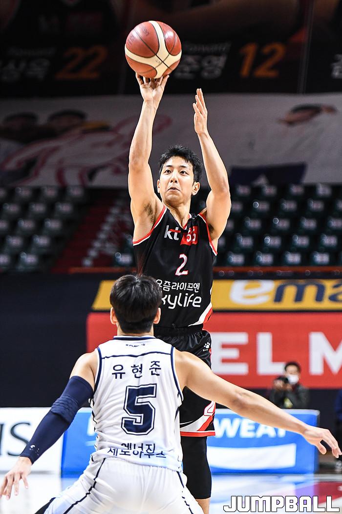 [점프볼=부산/박상혁 기자] 16일 부산사직체육관에서 열린 2020-2021 현대모비스 프로농구 부산 KT와 전주 KCC의 경기, KT 허훈이 3점슛을 시도하고 있다.