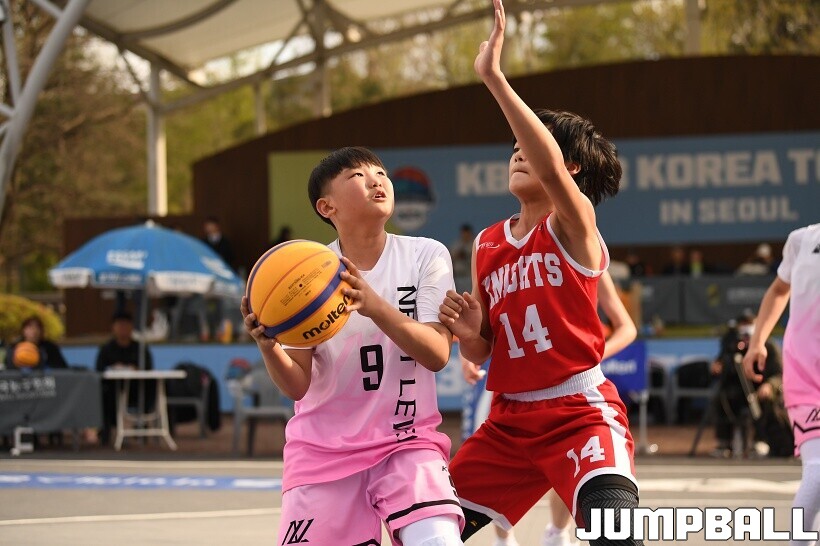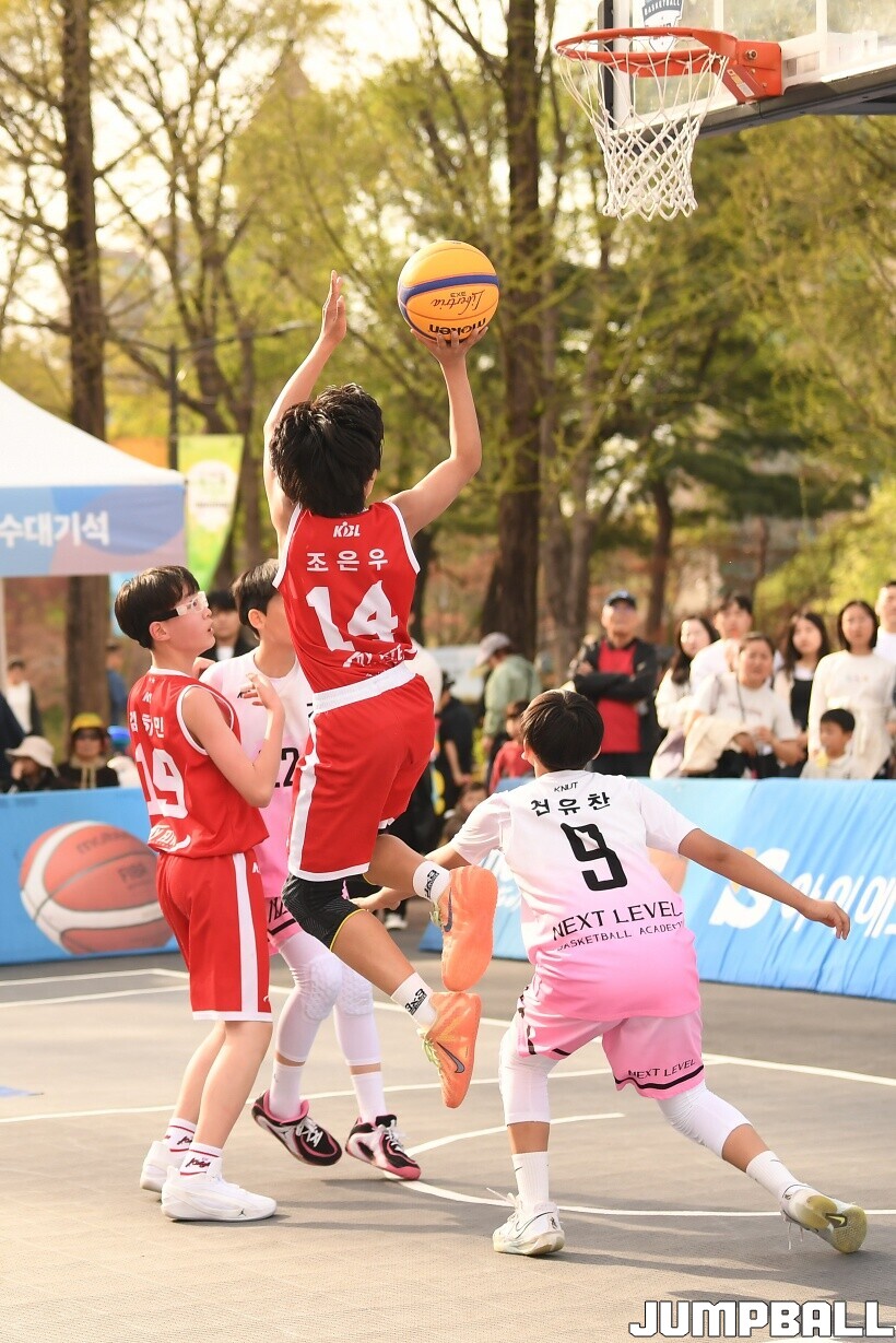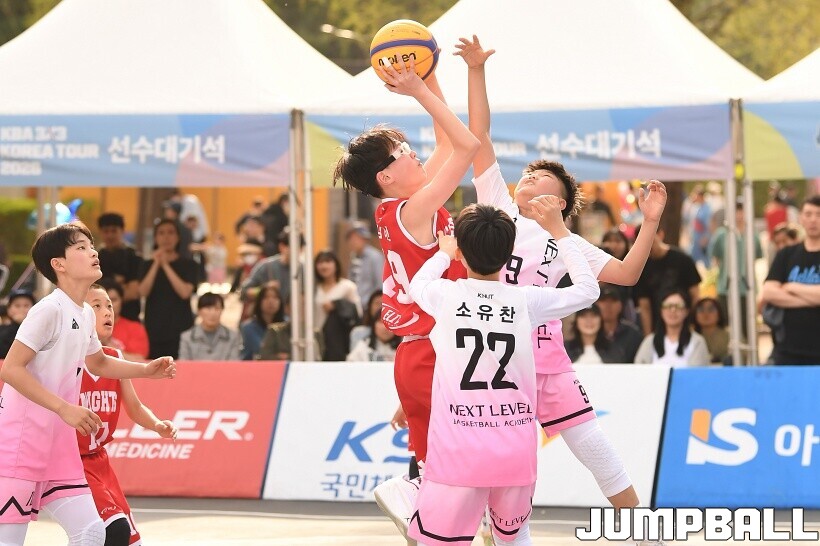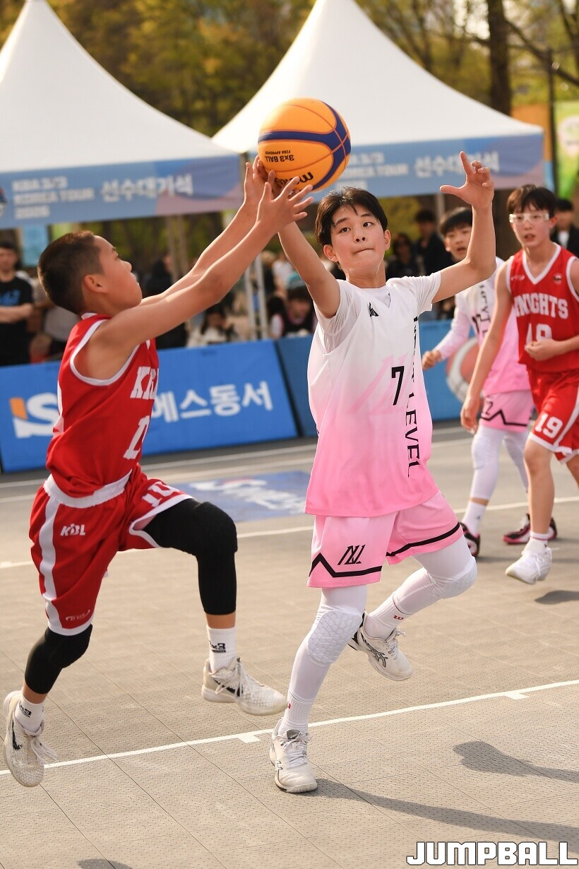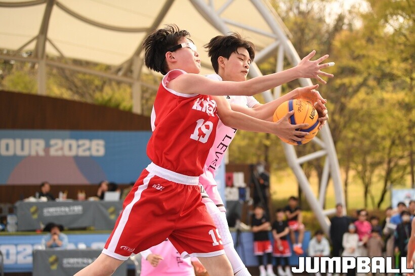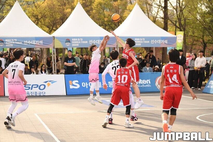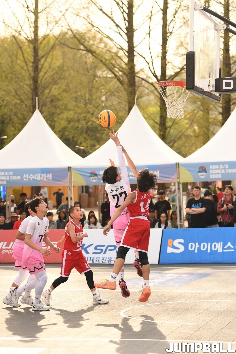 [점프볼=서울/유용우 기자] 12일 서울어린이대공원 열린무대 앞 특설코트에서 KBA 3x3 코리아투어 2026 서울대회 2일차 경기가 열렸다. 초등부, 중등부, 고등부, 오픈부, 여자오픈부 5개 종별 61개팀 234명이 참가했다. KBA 3x3 코리아투어 2026 서울대회 참가 선수들이 본선 토너먼트에 돌입하여 치열한 경쟁을 펼쳤다.