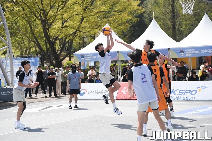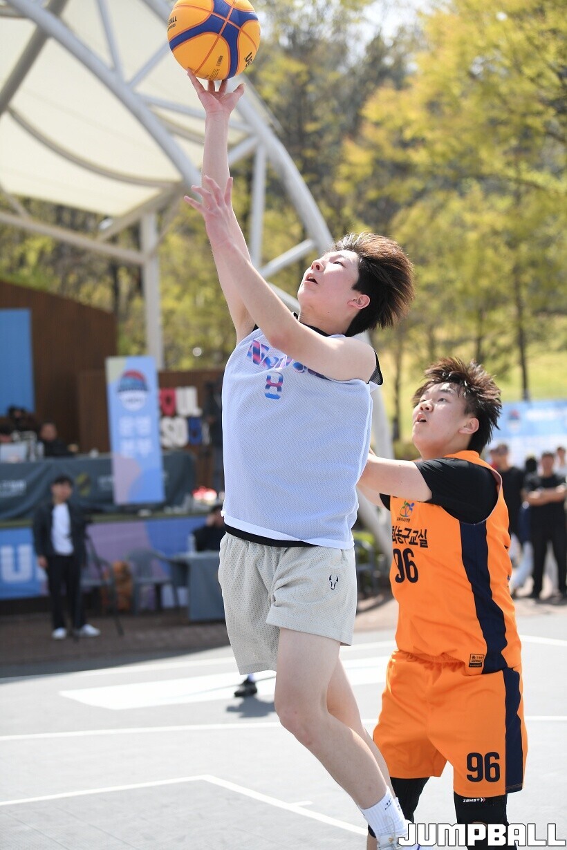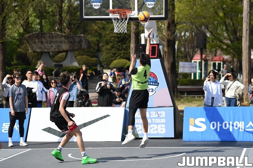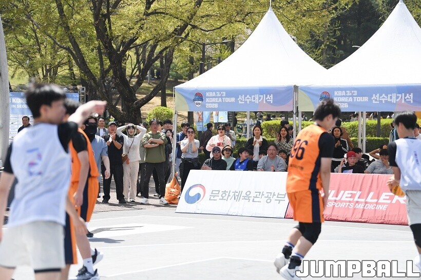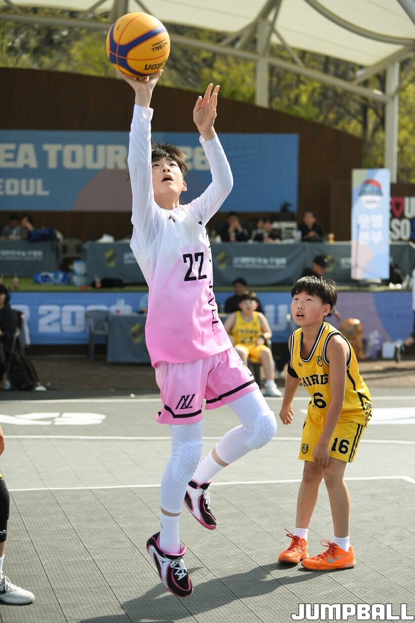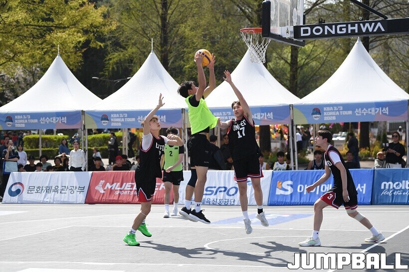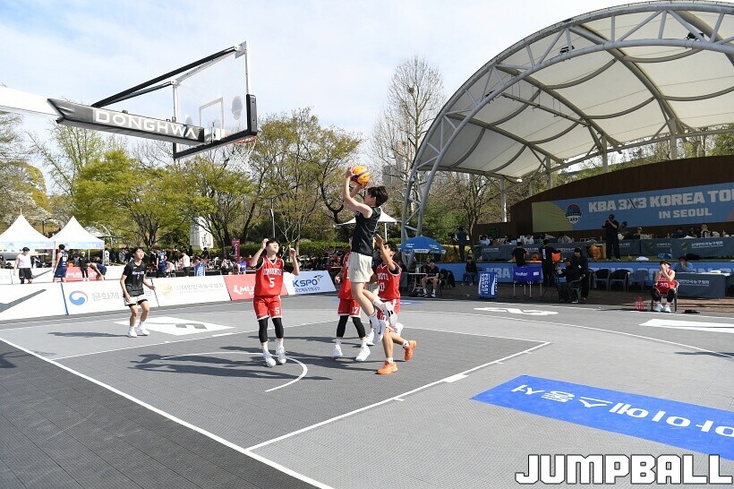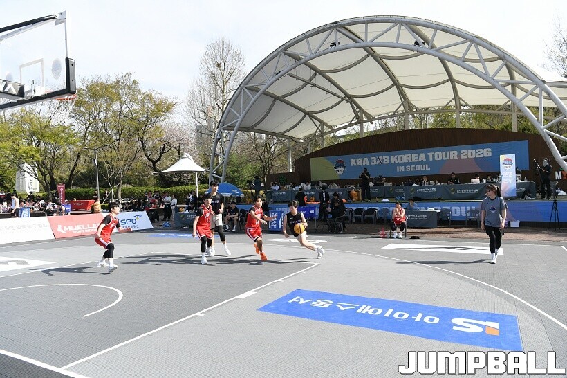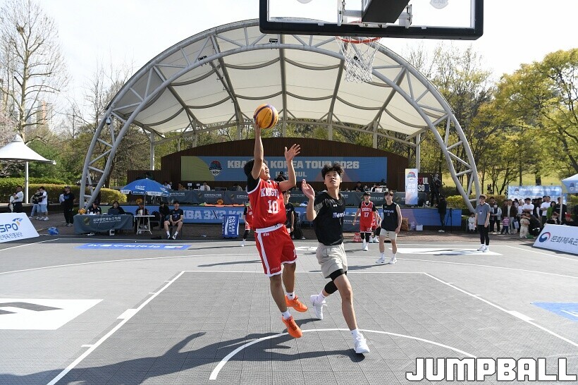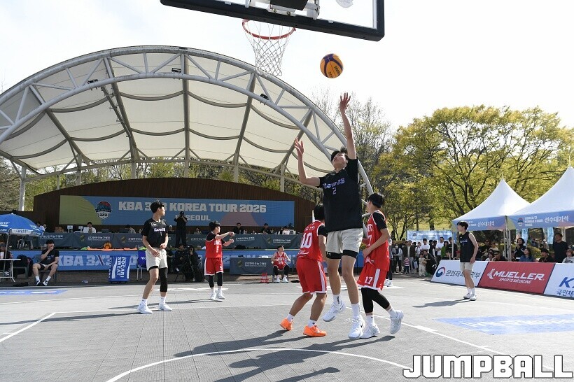 [점프볼=서울/유용우 기자] 12일 서울어린이대공원 열린무대 앞 특설코트에서 KBA 3x3 코리아투어 2026 서울대회 2일차 경기가 열렸다. 초등부, 중등부, 고등부, 오픈부, 여자오픈부 5개 종별 61개팀 234명이 참가했다. KBA 3x3 코리아투어 2026 서울대회 참가 선수들이 본선 토너먼트에 돌입하여 치열한 경쟁을 펼쳤다.