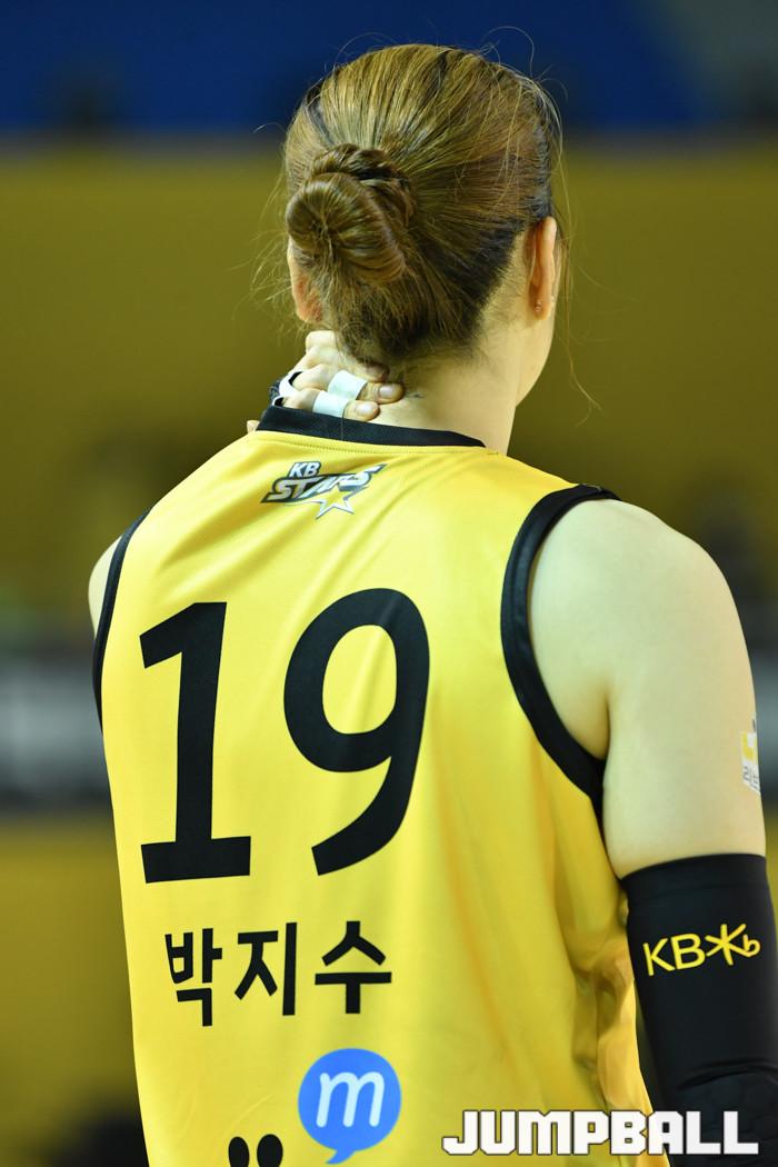 [점프볼=청주/유용우 기자] 11일 청주실내체육관에서 열린 'KB국민은행 Liiv M 2020-2021 여자프로농구' 청주 KB와 용인 삼성생명의 챔피언결정전 3차전, KB 박지수가 목부상을 의식하며 어루만지고 있다.