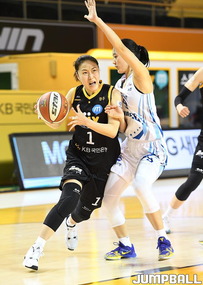 [점프볼=청주/문복주 기자] 21일 청주체육관에서 열린 KB국민은행 LiiV M 2020~2021 여자프로농구 청주 KB스타즈와 아산 우리은행의 경기, KB스타즈 염윤아가 골밑으로 순간 돌파를 시도하고 있다.