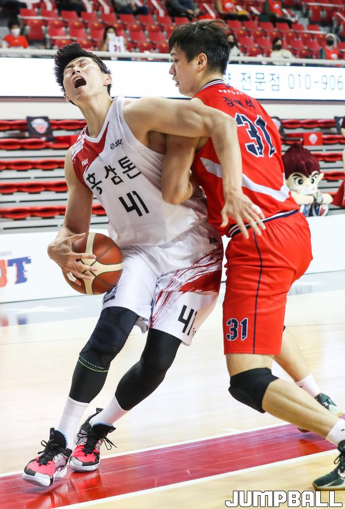 [점프볼=윤민호 기자] 18일 울산 동천체육관에서 열린 2020-2021 현대모비스 프로농구 울산 현대모비스와 안양 KGC의 경기에서 KGC 오세근이 현대모비스 장재석에게 파울 당하고 있다.