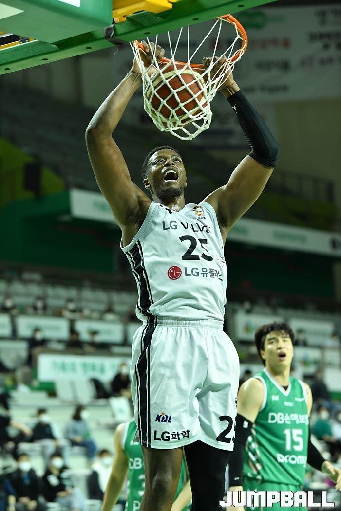 [점프볼=원주/유용우 기자] 10일 원주 종합체육관에서 열린 2020-2021 현대모비스 프로농구 원주 DB와 창원 LG의 경기, LG 캐디 라렌이 덩크를 하고 있다.