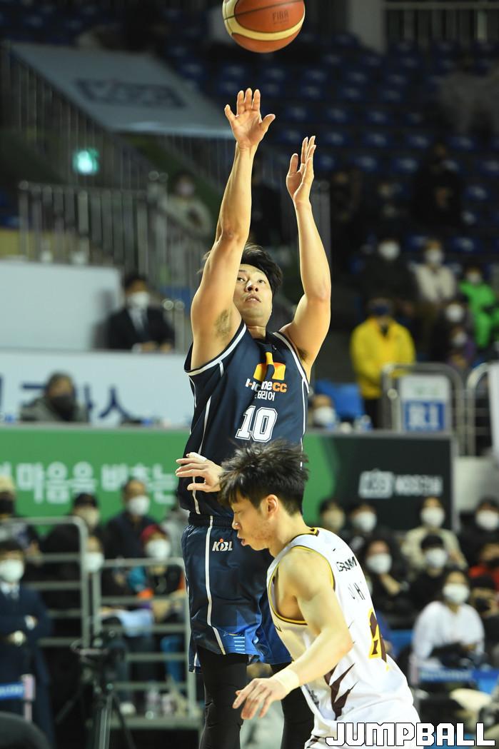 9일 전주실내체육관에서 열린 2021-2022 KGC인삼공사 정관장 프로농구 전주 KCC와 창원 LG의 경기, KCC 송창용이 3점슛을 시도하고 있다.