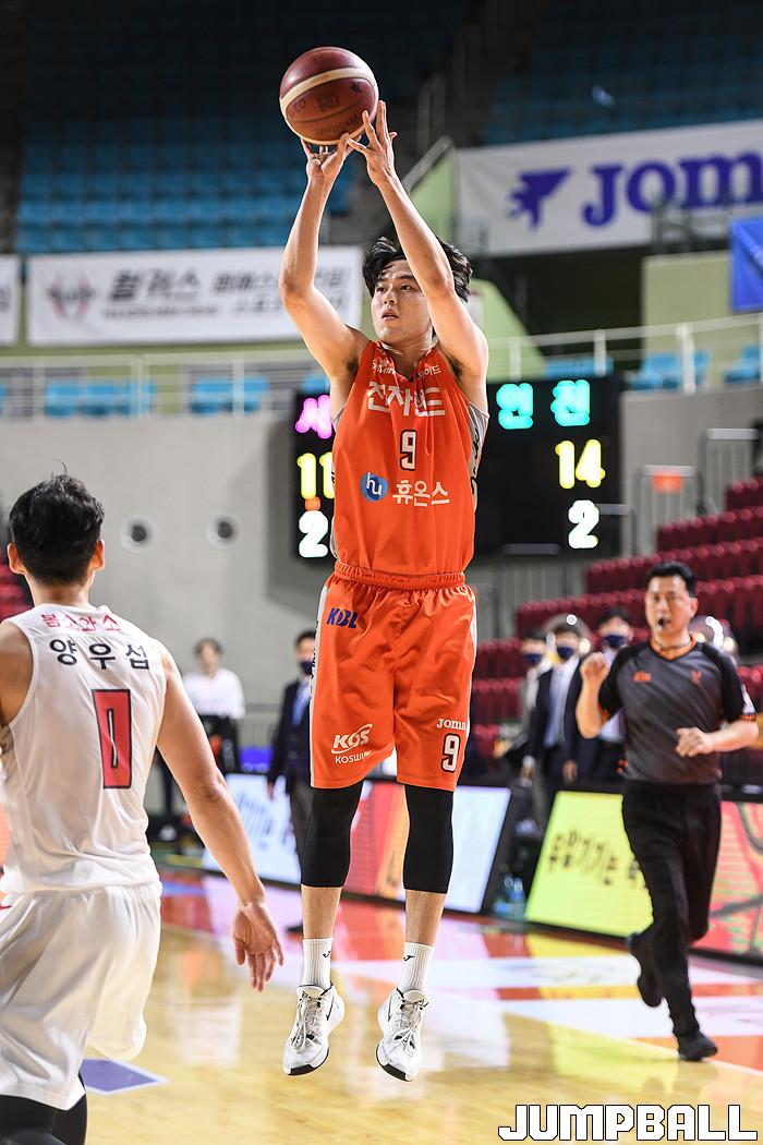 [점프볼=인천/박상혁 기자] 10일 인천삼산체육관에서 열린 2020-2021 현대모비스 프로농구 인천 전자랜드와 서울 SK의 경기, 전자랜드 전현우가 3점슛을 시도하고 있다.