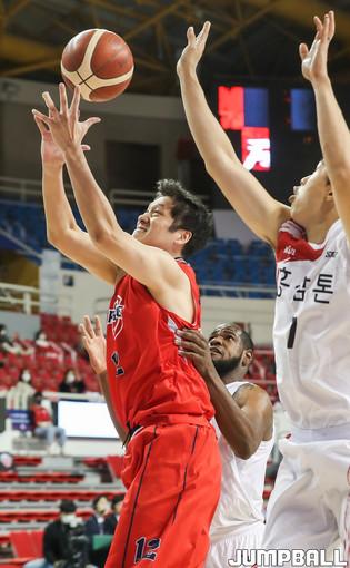 [점프볼=윤민호 기자] 18일 울산 동천체육관에서 열린 2020-2021 현대모비스 프로농구 울산 현대모비스와 안양 KGC의 경기에서 KGC 이재도가 현대모비스 숀롱의 수비를 피해 슛을 하고 있다.