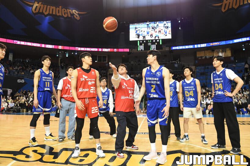 19일 잠실체육관에서 열린 2022-2023 SKT 에이닷 프로농구 서울 삼성과 서울 SK의 이번 시즌 마지막 S더비 경기, 경기 시작 전 영화 리바운드의 배우 안재홍이 점프볼을 올리고 있다.