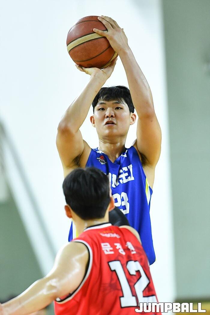 25일 고려대학교 화정체육관에서 열린 2023 KUSF 대학농구 U-리그 고려대와 연세대의 경기, 연세대 이규태가 슛을 던지고 있다. [점프볼=안암/유용우 기자]