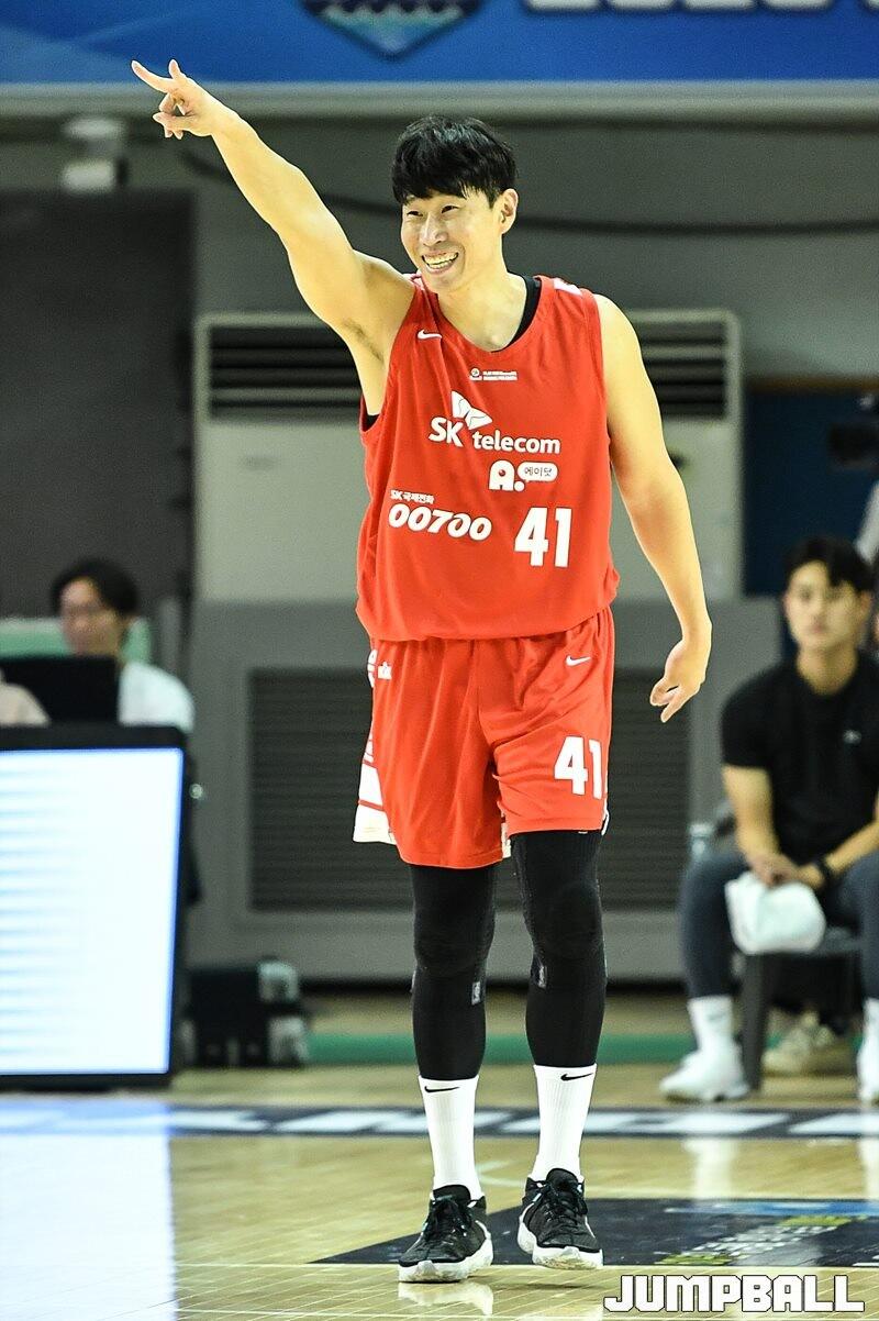 12일 군산월명체육관에서 열린 2023 MG새마을금고 KBL 컵대회 SK와 소노의 예선 경기, SK 오세근이 슛을 성공하고 세레머니를 펼치고 있다. [점프볼=군산/유용우 기자]