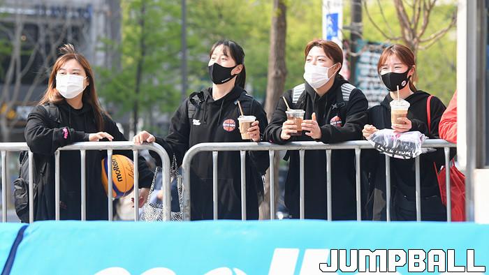 [점프볼=서울/박상혁 기자] 10일 서울신문사앞 특설코트에서 열린 KB국민은행 LIIV m 3X3 코리아투어 2021 서울 대회, 여자부 1EYENBA 선수들이 다른팀을 응원하고 있다.