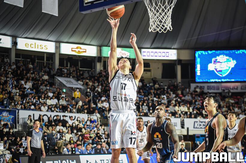 26일 전주실내체육관에서 열린 2022-2023 SKT 에이닷 프로농구 전주 KCC와 수원 KT의 경기, KT 김준환이 골밑슛을 시도하고 있다.
