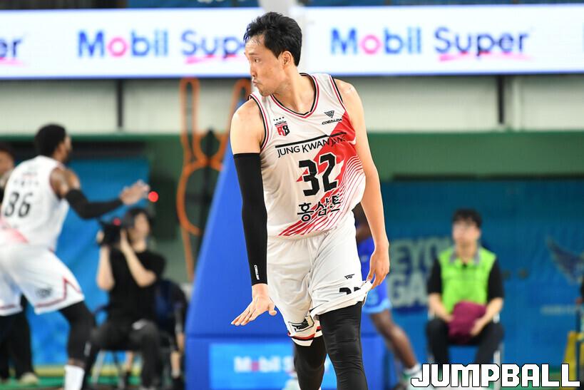 5일 대구체육관에서 열린 2023-2024 정관장 프로농구 대구 한국가스공사와 안양 정관장의 경기, 정관장 이종현이 백코트하며 세레머니를 펼치고 있다. [점프볼=대구/유용우 기자]