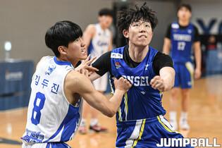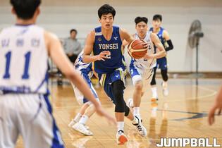 2일 연세대 신촌캠퍼스 체육관에서 열린 2023 KUSF 대학농구 U-리그 연세대와 중앙대의 경기, 연세대 유기상이 3점슛을 시도하고 있다.